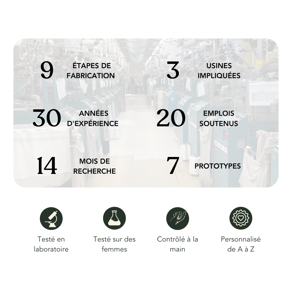Notre collant est en partie réalisé à la main avec plus de 9 étapes de fabrication. En produisant en France, nous avons pu construire une relation de confiance avec notre producteur qui nous a accompagné sur la recherche et le développement de notre super collant.
